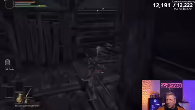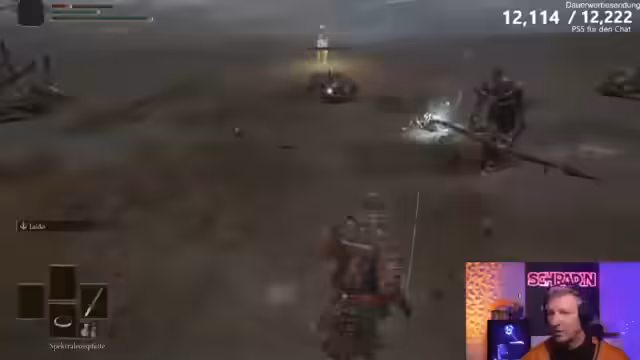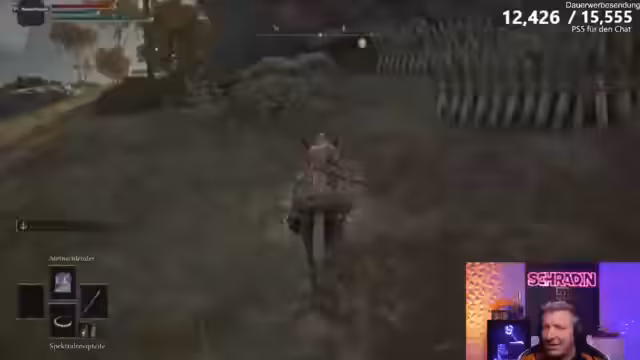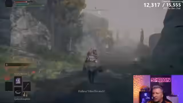 06:39:00Der Spieler verlässt die Kirche links, um nicht von Gegnern angegriffen zu werden, und reitet entspannt runter. Frustration über eigene Fehler und die Schwierigkeit des Spiels kommen auf. Der Spieler fragt sich, wer die Idee hatte, Elden Ring zu spielen. Es wird betont, dass volle Konzentration benötigt wird und der Spieler auf dem Pferd bleiben soll, um hochzukommen. Nach dem Absteigen soll der Mana-Trank ausgewählt und die Konzentration auf das Anvisieren des Gegners gelegt werden. Der Spieler soll R1 drücken und immer nur feuern, wenn der leuchtende Punkt auf dem Gegner zu sehen ist. Es wird empfohlen, sich etwas nach rechts zu bewegen, um den Punkt wieder gut zu sehen und den Gegner anzuvisieren. Der Spieler soll sich Zeit lassen und sich nicht von der Gefährlichkeit der Situation ablenken lassen. Das Anvisieren wird als wichtiges Element hervorgehoben. Der Spieler hat Schwierigkeiten, den Gegner anzuvisieren, und wird angewiesen, sich etwas rüberzubewegen. Es wird ein Mana-Trank benötigt. Der Spieler fragt, wie er den Trank trinkt, und es wird erklärt, dass er Quadrat drücken muss, wenn er ihn ausgerüstet hat. Es wird erklärt, dass die Projektile sich zum Gegner steuern, aber dieser muss anvisiert sein. Der Spieler wird getroffen, verliert aber nicht viel Leben und trinkt wieder einen Trank. Der Spieler hat noch vier Tränke und muss sie smart einsetzen. Es wird betont, dass der Gegner anvisiert sein muss, und der Spieler soll die Kamera nach unten bewegen. Es wird ein Mana-Trank getrunken und weiter gezaubert. Es wird festgestellt, dass alle Tränke benötigt werden, aber es vielleicht reicht. Der Spieler soll wieder trinken und ein Item im Inventar benutzen, um Mana schrittweise zu regenerieren. Der Spieler soll schießen und warten, bis er wieder genug Mana hat. Nach einigen weiteren Treffern wird der Boss besiegt. Der Spieler erhält einen Gehstock und wird beglückwünscht. Es wird betont, dass es nicht so einfach war, wie es aussah. Der Streamer bedankt sich bei den Zuschauern und betont, dass es eine große Ehre ist, dass so viele Kolleginnen und Kollegen zuschauen und Support geben. Der Chat wird gebeten, aufzuhören, und der Streamer bedankt sich für die Subs und kündigt an, eine Playstation zu verlosen.