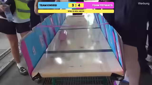 03:12:18Es wird ein neues Spiel namens 'Rollmisch' vorgestellt, bei dem Gegenstände so weit wie möglich gerollt werden müssen, ohne herunterzufallen. Die Spieler wählen aus fünf oder sechs Gegenständen und dürfen diese taktisch verstecken. Jeder Spieler hat nur einen Wurf. Die Punktzahl hängt davon ab, wie weit der Gegenstand gerollt wird. Es wird diskutiert, ob bergauf oder bergab gerollt werden soll. Team Clash Royale beginnt das Spiel. Ein Spieler erzielt zwei Punkte. Team Knossi wählt ein Spielzeugauto und erzielt ebenfalls zwei Punkte. Ein Pokéball wird gewählt, um auf einem Zeichen stehen zu bleiben, erzielt aber nur zwei Punkte. Eine Wasserflasche wird seitwärts geworfen und erzielt drei Punkte. Es wird angekündigt, dass es ein Best of Three geben wird. Um die erste Runde auszugleichen, muss ein Spieler drei Punkte erzielen. Es wird diskutiert, ob eine Linie für den Punkt zählt oder nicht. Schließlich wird entschieden, dass die Linie für den vorherigen Punkt zählt. Team Knossi gewinnt die erste Runde.