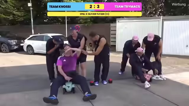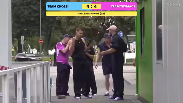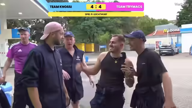03:28:18Es wird ein Aufruf für ein Meet & Greet bei Aral wiederholt. Die Teams werfen nun den Kescher, wobei ein Teammitglied Anlauf nimmt. Team Knossi wirft den Kescher weiter und erhöht auf 2:0. Nun kommt die 'Spuckrolle' zum Einsatz, ein Gegenstand, der mit Spucke befeuchtet wird, um ihn schwerer zu machen. Team Knossi erzielt damit den Anschlusspunkt zum 2:1. Es wird ein Gummi geworfen, der sehr weit fliegt, aber außerhalb des Spielfelds landet, was zum Ausgleich von 2:2 führt. Nun wird der Ballon gewählt, wobei diskutiert wird, ob er aufgeblasen oder mit Flüssigkeiten gefüllt werden soll. Es wird erwogen, in den Ballon zu pinkeln, um das Gewicht zu erhöhen, aber diese Idee wird verworfen. Stattdessen wird Spucke in den Ballon gefüllt. Beim Wurf tritt ein Spieler über, was zunächst als Fehlversuch gewertet wird, aber nach Diskussion mit dem Chat wird ein zweiter Versuch gewährt. Es wird versucht, Wasser in den Ballon zu füllen, was jedoch aufgrund des Wassers nicht funktioniert. Schließlich wird in den Ballon gestochen, wodurch die Spucke herausspritzt. Team Trimax erzielt einen Punkt und geht mit 3:2 in Führung. Die Muffinbackform wird gewählt und zusammengefaltet. Team Max wirft die Form weiter und erhöht auf 4:2, was zum Sieg führt. Das letzte Spiel wird nicht mehr gespielt, aber es wird trotzdem ein Wurf demonstriert. Team Trimax gewinnt mit 5:4. Die Taktik, die Gegenstände mit Spucke zu beschweren, wird als ekelhaft, aber effektiv beschrieben. Jens ist von der Ekelhaftigkeit des Spiels sichtlich fertig. Es wird erwähnt, dass Pisse erlaubt gewesen wäre.
