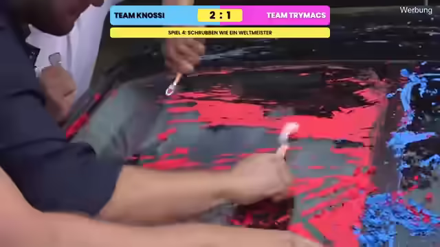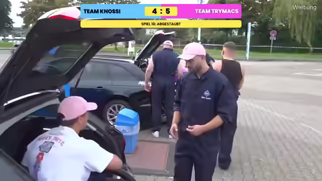 03:38:34Es wird angekündigt, dass das nächste Spiel doppelte Punkte zählt. Die Teams begeben sich zu den Autos, deren Kofferräume mit Konfetti gefüllt sind. Die Aufgabe besteht darin, die Kofferräume mit Staubsaugern so sauber wie möglich zu machen. Das Team, das zuerst keinen Konfetti mehr im Kofferraum hat, gewinnt das Spiel und erhält zwei Punkte. Es wird klargestellt, dass nur die Staubsauger verwendet werden dürfen und keine Hände. Es wird über die Teampartner für ein bevorstehendes Paddel-Event gesprochen. Die Teams beginnen mit der Reinigung der Kofferräume. Es wird beobachtet, dass ein Teammitglied den Aufsatz des Staubsaugers abschraubt, um effektiver zu sein. Team Knossi scheint zunächst die Nase vorn zu haben, aber Team Trimax holt auf. Ein Teammitglied scheint die letzten Konfettireste zu entfernen, aber es werden noch blaue Flecken und Chips entdeckt. Ein Team erklärt sich für fertig, aber es werden noch sechs Konfettireste gefunden. Es wird der Verdacht geäußert, dass ein Team Konfetti unter das Auto geschoben hat. Es wird diskutiert, ob nur Konfetti oder auch Chips zählen. Schließlich wird Team Trimax zum Sieger erklärt, da ihr Auto sauberer ist. Der Chat stimmt der Entscheidung zu. Team Trimax gewinnt das Spiel.