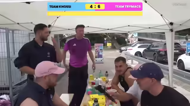 02:55:48Die ersten Würfe im Spiel verlaufen erfolglos. Es wird diskutiert, ob nach einem umgefallenen Turm die nachfolgenden Teams einen Vorteil haben. Die Teams einigen sich darauf, wer anfängt, und es wird über die Wurftechnik (rollen oder werfen) diskutiert. Sicherheitsbedenken werden geäußert, insbesondere bezüglich eines Spielers, der den Reifen wie einen Kugelstoßer werfen möchte. Die Würfe von Team Clash Royale sind weiterhin erfolglos, was zu Frustration führt. Die Regeln werden erneut erklärt, und es wird die Frage aufgeworfen, ob die Türme überhaupt umfallen können. Aufgrund der anhaltenden Misserfolge wird beschlossen, dass jeder Spieler zwei Würfe hat, was jedoch nicht von allen akzeptiert wird, da dies nicht den ursprünglichen Regeln entspricht. Trotz der Regeländerung bleiben die Würfe weiterhin erfolglos, was zu weiterer Frustration und Ungläubigkeit führt. Es wird überlegt, ob die Spieler absichtlich schlecht spielen, da es einfacher erscheint, sechs Fehlwürfe zu produzieren als einen Turm zu treffen.