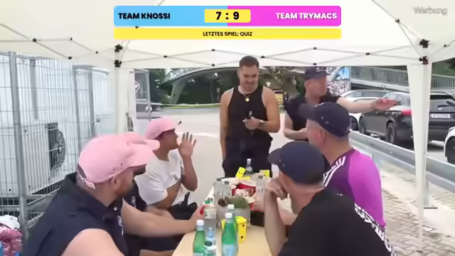 01:07:44Es beginnt ein Quiz mit mehreren Fragen, bei dem die Teams durch schnelles Buzzern Punkte sammeln können. Die Fragen reichen von Allgemeinwissen (Was ist ein Erdapfel?, Welche Farbe hat ein Smaragd?) bis hin zu Schätzfragen (Wie viel Liter Kraftstoff wurden 2023 in Deutschland verkauft?). Es gibt auch Fragen, die auf Geschwindigkeit und Assoziation abzielen (Wie viele Tiere nahm Moses mit auf die Arche?). Die Teams müssen aufstehen, um ihre Antwort zu geben. Die Stimmung ist wettbewerbsorientiert, aber auch humorvoll, mit einigen Fehlantworten und lustigen Kommentaren. Die Fragen werden schneller gestellt, um den Zeitdruck zu erhöhen. Es folgen weitere Fragen, die von der Anzahl der Ringe im Olympia-Symbol bis zur Mischung von Farben reichen. Die Teams sammeln Kilos für richtige Antworten, wobei es um Schnelligkeit und Genauigkeit geht. Es gibt Diskussionen über die Gültigkeit von Antworten und die Reihenfolge des Buzzerns. Die erste Runde endet mit einem knappen Ergebnis, wobei beide Teams frustriert über ihre bisherige Leistung sind. Die Regeln werden nochmals erklärt, insbesondere wie mit falschen Antworten umgegangen wird. Es folgen weitere Fragen, darunter Schätzfragen wie die Anzahl der Pizzen, die ein Deutscher pro Jahr isst. Die Teams liefern sich ein Kopf-an-Kopf-Rennen, wobei jede richtige Antwort zählt. Es kommt zu Diskussionen über die korrekte Antwort auf die Frage nach Cola und Fanta. Die Teams Knossi/Paul und Max/Niki treten gegeneinander an. Es werden Schätzfragen gestellt, wie lange der schnellste Boxenstopp in der Formel 1 gedauert hat. Die Teams liefern sich ein enges Rennen, wobei jede richtige Antwort zählt.