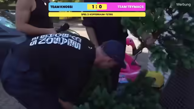 00:46:30Die zweite Challenge ist Kofferraum-Tetris. Die Teams müssen verschiedene Gegenstände, darunter einen Weihnachtsbaum, einen Staubsauger und ein Maskottchen, in ein Auto packen und alle Türen schließen. Für schwierigere Gegenstände gibt es mehr Punkte. Team Tick, Trick und Track demontiert den Weihnachtsbaum und verstaut die Gegenstände geschickt im Auto. Sie erreichen die maximale Punktzahl in 3 Minuten und 60 Sekunden. Team Clash Royale versucht ebenfalls, alle Gegenstände ins Auto zu bekommen, wobei es auf die richtige Anordnung und das Schließen der Türen ankommt. Es wird diskutiert, ob die Fenster geöffnet werden dürfen, um den Baum herausragen zu lassen, was erlaubt wird. Am Ende haben beide Teams die gleiche Punktzahl erreicht, aber Team Trick, Trick und Track gewinnt aufgrund der schnelleren Zeit.