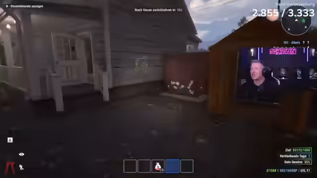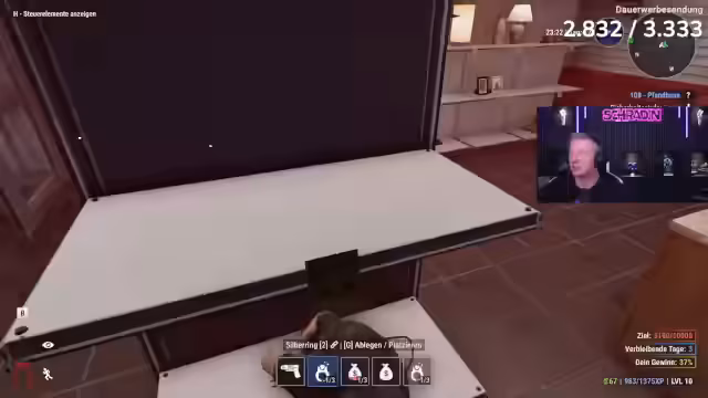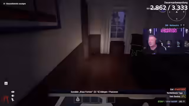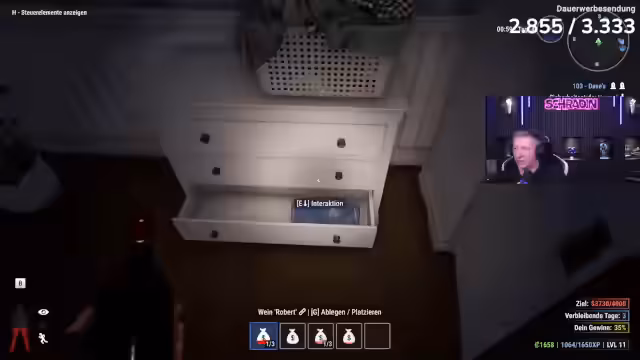 04:31:25Nachdem das Haus erfolgreich ausgeräumt ist und die Polizei nicht alarmiert wurde, ist der Raubzug geglückt. Die Beute ist beträchtlich und in einen Van verladen. Der Streamer und Chad suchen nun nach weiteren wertvollen Objekten, wie einem Ring und einem Gaming-PC. Ein nächstes Ziel ist eine Garage, die ebenfalls ausgeplündert werden soll, allerdings fehlt der Schlüssel. Die Diskussionen drehen sich darum, wie man den Zugriff auf das Fahrzeug erlangen kann, da ein spezieller Bohrer benötigt wird, den sie sich noch nicht leisten können.