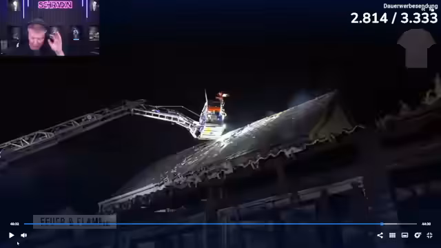 02:14:36Der Einsatz konzentriert sich darauf, ein Loch in das Dach zu sägen, um den Rauch und die Hitze abzuleiten und den Brandherd von oben bekämpfen zu können. Hierfür werden spezielle Diamantsägen der Feuerwehr eingesetzt, die auch durch Stahlträger und Beton durchdringen können. Der Streamer beschreibt den Einsatz der Rettungssäge, um Löcher in das Dach zu bohren. Es wird als 'Wettlauf gegen die Zeit' bezeichnet, da die Hitze und der Rauch zunehmen. Die Feuerwehrleute müssen dabei vorsichtig sein, da der Sauerstoffeintrag durch die geöffneten Löcher zu einer Verpuffung führen und das Feuer weiter anfachen kann.