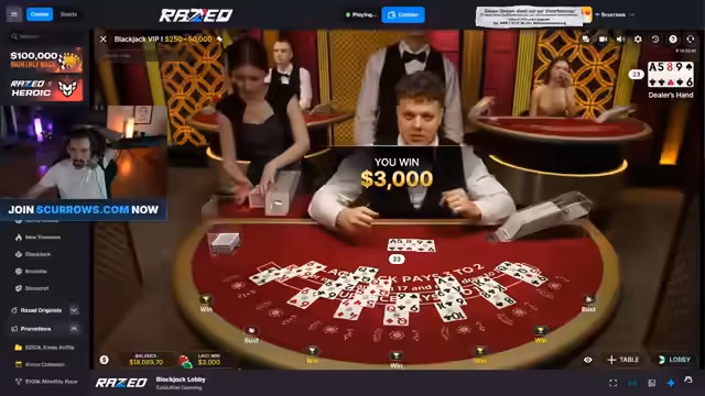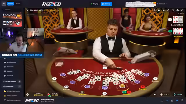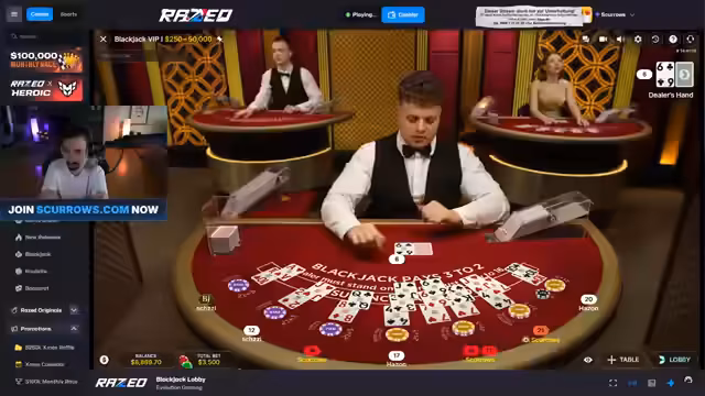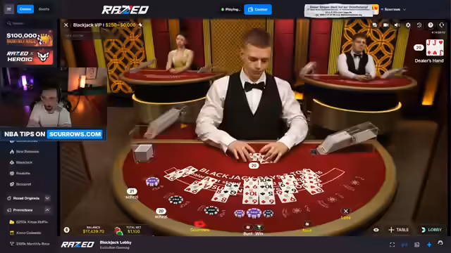 01:44:21Nach Problemen am normalen Tisch wechselt der Streamer zum 'Blackjack VIP 1' Tisch im Evolution-Live-Casino. Er kritisiert die Videoqualität und das Design, lobt aber das realistische Kartenhandling. Es folgen weitere Verluste und Diskussionen über Spielmechaniken wie Splitten und Doublen, wobei er wiederholt 'betrügerische' Tische bemängelt.