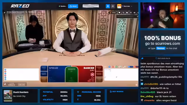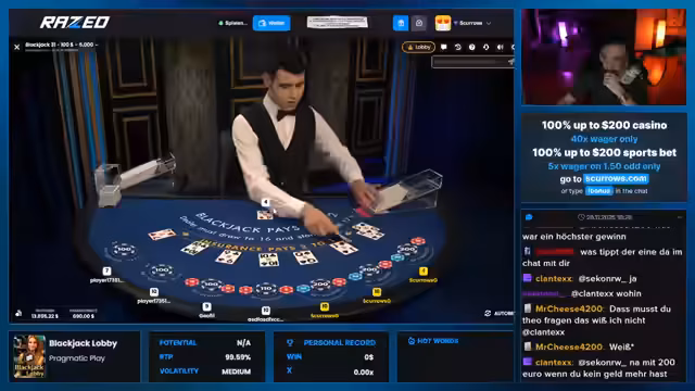 00:00:29Der Stream beginnt mit der Ankündigung von NBA-Tipps und VIP-Transfer, die ausschließlich auf der Webseite scurrows.com verfügbar sind. Streamer Bazzi ist live und wird zum Blackjack-Tisch geleitet. Der Streamer, Theo, bemerkt die hohen Mindesteinsätze von 500 Euro und kritisiert Bazzi, ihn zu einem unangemessen hohen Wager gezwungen zu haben, was zu einem sofortigen Verlust von 2.100 Euro führt. Bazzi verteidigt sein Verhalten, indem er argumentiert, er habe nur wetten müssen, und fordert Theo auf, das Spiel als 'Mann' weiterzuspielen.