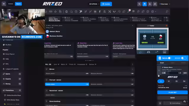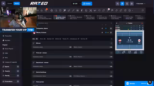 00:06:31Das Hauptthema des ersten Teils sind Tenniswetten, insbesondere auf das Match zwischen Sakkari Maria und Muchova. Der Streamer preist die Quote von 2.66 für den Sieg Sakkaris im ersten Satz als sehr attraktiv an und setzt selbst 3000 Dollar darauf. Er erläutert seine strategische Herangehensweise: Er konzentriert sich auf Value-Wetten, bei denen er einen Vorteil gegenüber dem Casino sieht, anstatt nur auf den Gesamtsieg zu tippen. Er betont, dass solche Wetten, trotz des Risikos, bei korrekter Quote profitabel sein können.