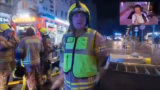 00:04:42Es wird von einem laufenden Feuerwehreinsatz berichtet, bei dem es in einem Gebäude im dritten Stockwerk brennt. Zahlreiche Menschen sind betroffen, darunter eine Mutter mit vier kleinen Kindern. Die Feuerwehr ist mit einem Großaufgebot vor Ort und versucht, die Bewohner zu retten. Ein Arm einer Drehleiter wird hochgefahren, um Personen aus dem Gebäude zu bergen. Ein Team dringt mit Atemschutzgeräten in das Gebäude ein, um Menschen zu retten, während ein anderes Team die Löscharbeiten vorbereitet. Die erste Person wird bereits gerettet, während dichter Rauch aus dem Gebäude dringt. Das Feuer ist im Keller ausgebrochen und hat sich im Treppenhaus ausgebreitet, wodurch Bewohner an den Fenstern auf Rettung warteten. Die Feuerwehr hat das Feuer unter Kontrolle gebracht und rettet Personen mit Drehleitern und sucht nach einer Abluftöffnung im Keller. Ein Bus der BVG wurde bereitgestellt, um den evakuierten Bewohnern einen warmen Aufenthaltsort zu bieten. Es wird die mangelnde Einsicht einiger Passanten kritisiert, die trotz der Notlage Feuerwerkskörper zünden. Ein Spezialfahrzeug für Hygiene ist vor Ort, um den Einsatzkräften das Umziehen in sauberer Kleidung zu ermöglichen.