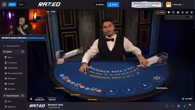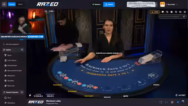 02:48:12Nach den frustrierenden Slot-Erlebnissen wechselt der Streamer zum Blackjack, wo er auf Bazzi am Tisch wartet. Er kündigt an, sich an ein Limit von 200 Dollar pro Hand zu halten, beklagt jedoch sofort, dass er bereits 220 Dollar setzt und die Bank ständig gute Karten zieht. Er verliert schnell 1000 Dollar an diesem Tisch und beschwert sich über die vermeintliche Manipulation des Spiels, da die Bank dreimal hintereinander eine 16 zieht und nicht überkauft. Trotzdem gelingen ihm einige Gewinne, die er als 'Glück' bezeichnet, und er schafft es, 2000 Dollar im Blackjack zu gewinnen. Er betont erneut, dass scurrows.com das 'Allerbeste auf dem Markt' sei. Die Session endet mit weiteren Verlusten und dem Vorhaben, ab morgen mit einer höheren Balance zu spielen.
