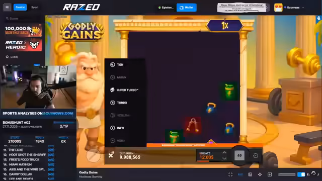 00:00:17Der Streamer begrüßt seine Zuschauer und berichtet über eine äußerst erfolgreiche letzte Nacht, in der alle NBA-Spiele korrekt getippt wurden, was zu einer beeindruckenden Quote führte. Er erwähnt auch ein Arsenal-Spiel, das leider nicht wie erhofft verlief, aber die vorherigen Tage waren sehr profitabel. Aktuell läuft eine Bonus-Hunt auf Skrillers.com, bei der verschiedene Spiele von Hexo Gaming durchgespielt werden. Die Bonus-Hunt startete zunächst katastrophal, läuft aber mittlerweile sehr gut. Zuschauer werden ermutigt, Skrillers.com selbst zu überprüfen, um die vielfältigen Möglichkeiten zu entdecken. Es wird auch kurz über andere Spiele wie Tiger Legends gesprochen und die Schwierigkeit, Freispiele in einigen Slots zu erhalten. Der Streamer plant, ab morgen die Tonspuren für Musik im Hintergrund zu deaktivieren, um diese öfter im Stream spielen zu können.