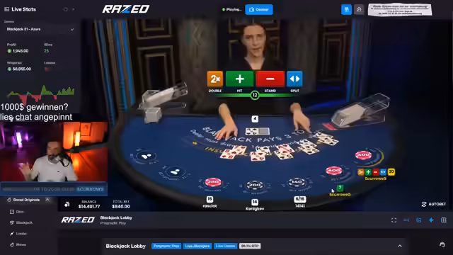 00:12:50Die meiste Zeit wird mit dem Spielen von verschiedenen Slots wie Lucky Ladies Charm Deluxe und Sweet Bonanza verbracht. Der Streamer wechselt mehrmals den Slot, da er von der Performance enttäuscht ist. Er spielt auf kleinen Einsätzen (10 Euro), um es für die Zuschauer realistischer zu gestalten. Parallel dazu versucht er, einen Blackjack-Tisch zu spielen, um seine statistische Vorgehensweise und sein Können zu demonstrieren, was aufgrund von technischen und emotionalen Schwierigkeiten jedoch holprig verläuft.