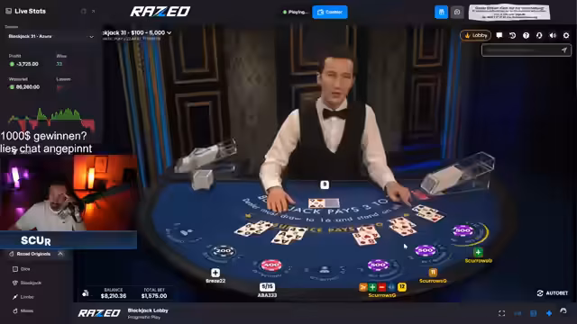 03:35:12Die Blackjack-Session eskaliert mit massiven Verlusten. Nach einem Hoch von 22.000 Dollar fällt das Konto auf 6.000 Dollar. Der Streamer verliert Runden kontinuierlich, wenn die Bank eine 10 zieht, und äußert sich zunehmend frustriert und paranoid. Er beschreibt das Verhalten als "scam" und ist kurz davor, den Stream aus Frust zu beenden.