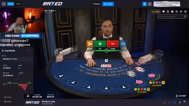 02:49:22Der Streamer wechselt vom Slots zu Blackjack. Er bezeichnet es als besseres Spiel und gibt zu, dass er selbst der Beste im Blackjack sei. Er beginnt mit hohen Einsätzen und zeigt sich frustriert über die Häufigkeit von Verlusten, insbesondere wenn die Bank eine 10 oder ein Ass hat. Er äußert den Verdacht, dass die Software manipuliert sei.