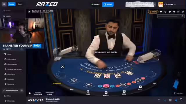 00:39:29Es werden Betrugsvorwürfe gegen das Online-Blackjack-System erhoben, da die Chips des Streamers angeblich über dem Deck liegen, ohne sich zu bewegen, was als 'Betrug' und 'lächerlich' bezeichnet wird. Es wird die Polizei gerufen und ein Clip des Vorfalls gefordert. Der Wunsch, nur zu zweit an einem Blackjack-Tisch zu spielen, um mehr Kontrolle zu haben, wird geäußert. Es wird die Strategie diskutiert, bei bestimmten Händen zu 'dubbeln' oder zu 'ziehen', und die Frustration über verlorene Runden wird deutlich. Eine humorvolle Interaktion über die Einsätze von Batzi, die als 'frech' und 'niedrig' bezeichnet werden, findet statt. Es wird auch über die Möglichkeit gesprochen, im nächsten Casino mit einer neuen Balance zu spielen.