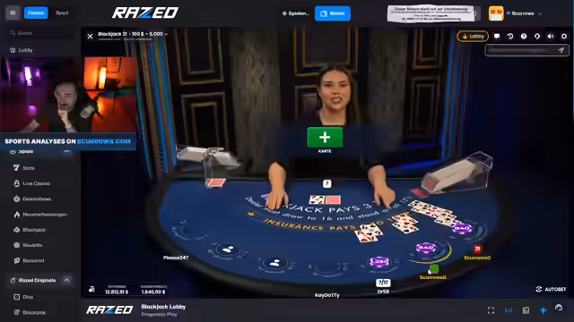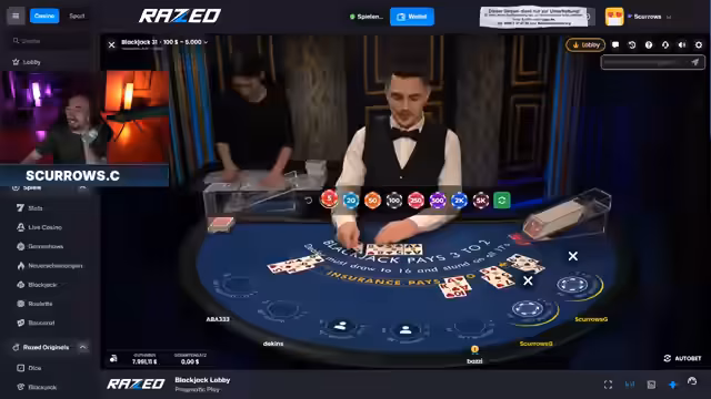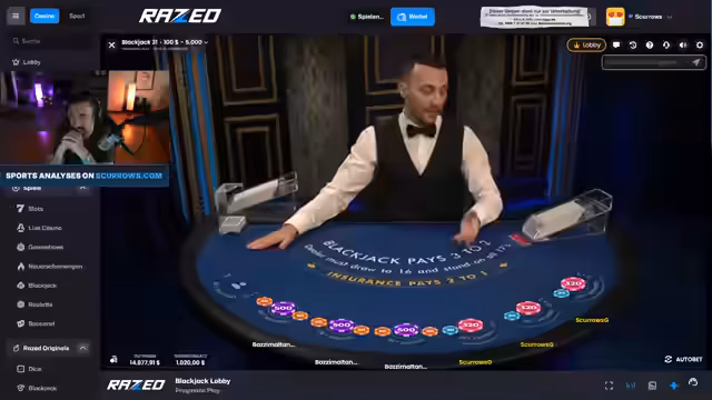 05:48:28Die Diskussion zwischen dem Streamer und 'Batzi' über die Spielstrategien im Casino geht weiter, wobei 'Batzi' angeblich 1000 Euro schuldet, die er im Casino erhalten hat. Der Streamer äußert seine Frustration über wiederholte Verluste beim Blackjack, insbesondere gegen eine vermeintlich geringe Hand des Dealers. Es wird über die Möglichkeit gesprochen, 'Punto Banco' oder 'Blackjack' zu spielen, wobei der Streamer seine Abneigung gegen den aktuellen Tisch und die dortigen Verluste deutlich macht. Parallel dazu werden Sportwetten-Tipps für Fußballspiele wie Dortmund, Chelsea und City besprochen. Es wird erwähnt, dass 'grossbets.com' bereits erste Fußball-Tipps veröffentlicht hat, und der Streamer teilt seine Einschätzung zu den Spielen. Die Diskussion wird hitzig, als 'Batzi' die 'Skurrus-Bets' in Frage stellt und der Streamer seine Trefferquote von 17 zu 4 hervorhebt. Die Spannung steigt, als der Streamer und 'Batzi' sich auf ein Blackjack-Spiel einlassen, bei dem der Streamer weitere Verluste erleidet und seine Verzweiflung über die vermeintliche Pechsträhne zum Ausdruck bringt.