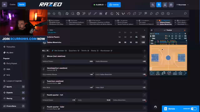 03:31:21Während laufender NBA-Spiele werden Live-Wetten platziert. Insbesondere wird auf den Ausgleich von Indiana Pacers gesetzt, nachdem diese in Rückstand geraten sind. Der Streamer schildert, wie er wetten würde, um das Blatt zu wenden, und erwähnt, dass er selbst auf Warriors und Pacers gesetzt hat. Währenddessen verliert er Geld im Slot-Spiel, da die erwarteten großen Gewinne ('Fat Bombs') ausbleiben. Der physische Zustand des Streamers wird immer müder, was die gesamte Atmosphäre belastet. Er müsse jedoch noch mehrere Stunden streamen.