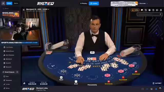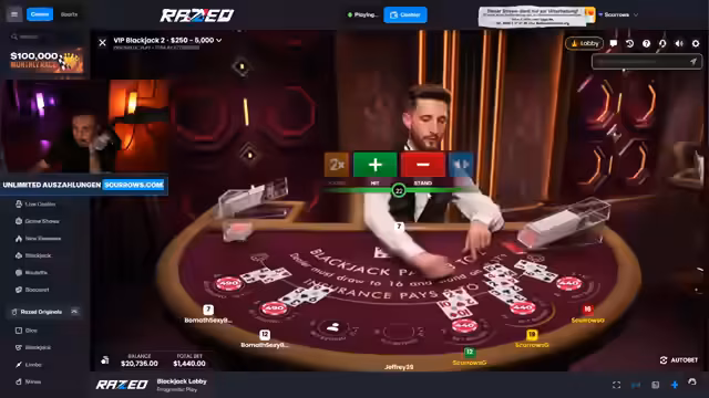 00:59:27Der Stream beginnt mit intensiven Blackjack-Spielen. Scurrows berichtet von aggressiven Spielerlebnissen und häufigen Niederlagen, die ihn emotional stark mitnehmen. Er wechselt zwischen Euphorie über seltene Gewinne und Frust über andauernde Verluste, was ihn zu wiederholten Selbstreflexionen über sein Spielverhalten und seine Nervenstärke führt. Er erwähnt, dass er nach einer besonders verlustreichen Runde mit 3000 Dollar Einsatz kurzzeitig mit dem Aufhören des Streams droht.