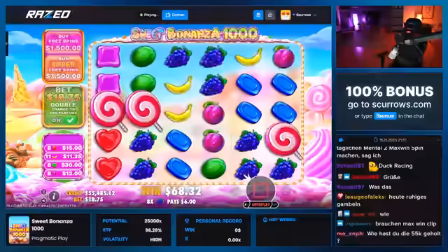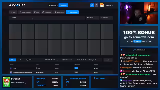 01:55:09Nach den Blackjack-Verlusten wechselt der Streamer zu Slots und erzielt dort einen beachtlichen Gewinn von 4.100 Dollar in Gates of Olympus. Dieser Erfolg bringt ihn wieder ins Plus für den Tag und wird mit großer Freude und Erleichterung gefeiert. Er bedankt sich bei den Zuschauern für die Follows und die Unterstützung während der emotionalen Blackjack-Session. Zudem hebt er die Vorteile von scurrows.com hervor, wie den 100% seriösen Service, fehlende Auszahlungslimits, die Möglichkeit, VIP-Level zu übertragen, sowie monatliche und wöchentliche Boni. Er erwähnt auch kostenlose Sportwetten-Tipps für die NBA und den Discord-Server für Support.