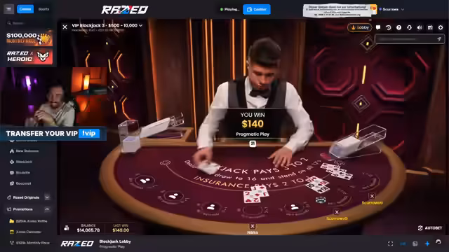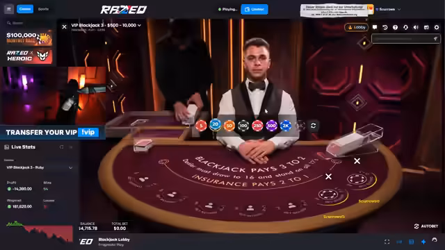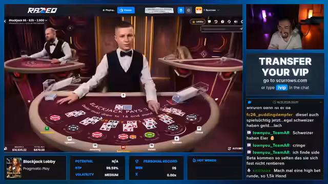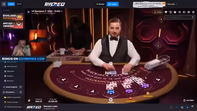 00:39:40Nach Slot-Sessions wechselt der Streamer zu Blackjack und sucht aktiv nach einem passenden Tisch. Während des Spiels analysiert er Spielentscheidungen wie Ziehen, Stehen und Splitten von Karten. Er kommentiert unglückliche Züge, Bank-Gewinne und Side-Bet-Versuche, begleitet von emotionalen Reaktionen auf Verlustserien. Die Diskussion um Strategien und die Kritik an der Dealer-Geschwindigkeit unterstreichen seine Konzentration auf das Spielprinzip.