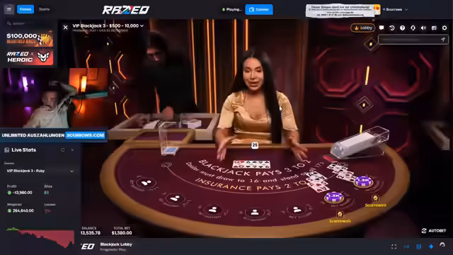 04:09:03Die finanzielle Dimension der Session wird deutlich. Der Streamer verliert massiv, unter anderem 13.000 Einheiten seit Streamstart. Er beklagt die ständigen Niederlagen trotz hoher Einsätze und bezeichnet die Session als eine der härtesten überhaupt. Die Dealer-Luck, insbesondere die Häufigkeit von 10er-Karten für das Haus, wird als mathematisch unmöglich und rigged beschrieben. Die Verluste führen zu starkem Frust und dem Gefühl, nicht gewinnen zu können.