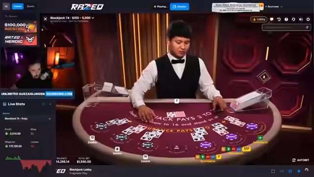 01:13:07In einer Phase ständiger Blackjack-Niederlagen äußert sich der Streamer frustriert über die Spielmechanik. Er beobachtet ein wiederkehrendes Muster, bei dem die Bank in kritischen Momenten immer eine 10 zieht, sobald er selbst ins Plus kommen könnte. Dies beschreibt er als 'psychospiel' und 'kriminell'. Besonders geprägt sind seine Aussagen von Unverständnis über scheinbar manipulierte Zugfolgen: Nachdem er mehrere Runden verloren hat, führt er statistische Berechnungen an und vergleicht seine Wahrnehmung mit tatsächlichen Ergebnissen. Insgesamt entwickelt sich eine Diskussion über Spielstrategien (z.B. das Stehen bleiben bei 16 gegen 10), bei der er seine Entscheidungen hinterfragt und Verluste analysiert.