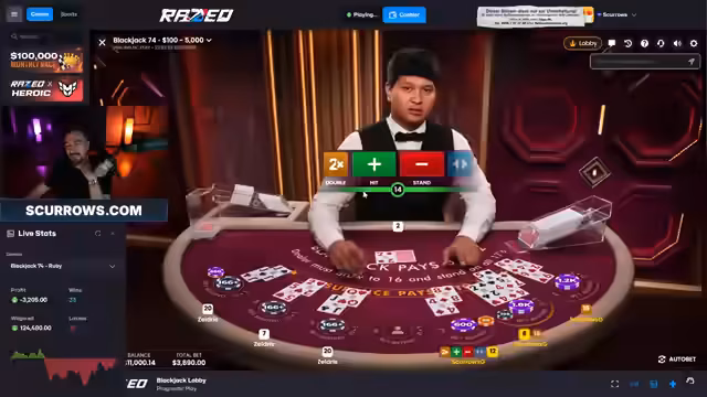 00:05:03Nachdem ein Prime-Abonnent (Philipp Rosen) erwähnt wurde, diskutiert der Streamer seine Spielstrategie gegen eine Bank mit 10. Er entscheidet sich gegen ein Dubeln und zieht stattdessen eine Karte, verliert aber trotzdem. Es folgt eine längere Phase intensiven Blackjack-Spiels mit detaillierten Beschreibungen von Händen, Duble-Entscheidungen und emotionalen Reaktionen auf Gewinne und Verluste. Der Streamer analysiert seine Spielzüge kritisch, vergleicht Wahrscheinlichkeiten und beklagt sich über scheinbar unfair wirkende Zugfolgen der Bank, die oft auf 10 oder 20 kommt. Er erwähnt am Rande NBA-Wetten (z.B. auf Player-Props wie Jalen Brunson) und Basketball-Spiele wie Magic gegen Knicks oder Spurs gegen OKC mit Wembanyama.