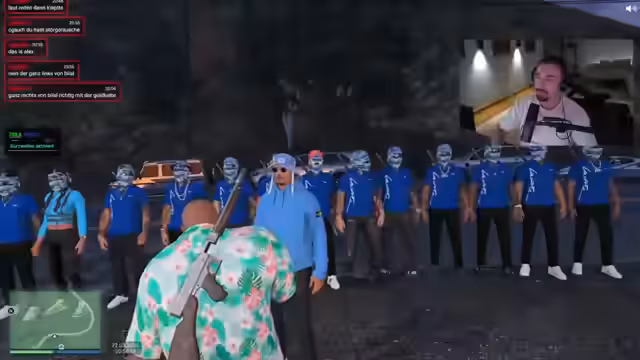 00:42:56Es werden technische Probleme mit Störsignalen diskutiert, die von verschiedenen Mitarbeitern verursacht werden. Der Streamer droht mit Hinrichtungen, sollte das Problem nicht behoben werden. Er will das Problem mit dem Mikrofon in Ruhe beheben. Ein Motorrad fährt auf den Berg. Der Streamer wird von Zwingo Mengo angerufen, der vor der Tür steht. Der Streamer geht mit Maske vor die Tür. Niemand soll drohen oder die Waffe ziehen. Das Emote soll entfernt werden. Bilal, alias Alex, kommt hinzu und sagt, dass er nur reden will. Der Streamer wirft ihm Respektlosigkeit vor, da er mit bewaffneten Leuten vor seinem Anwesen steht. Bilal erklärt, dass er das, was gestern passiert ist, nicht so stehen lassen kann. Er möchte seine Waffen zurück, die angeblich von den Leuten des Streamers aufgesammelt wurden. Er vermutet, dass es sich um zehn Gusenbergs handelt.