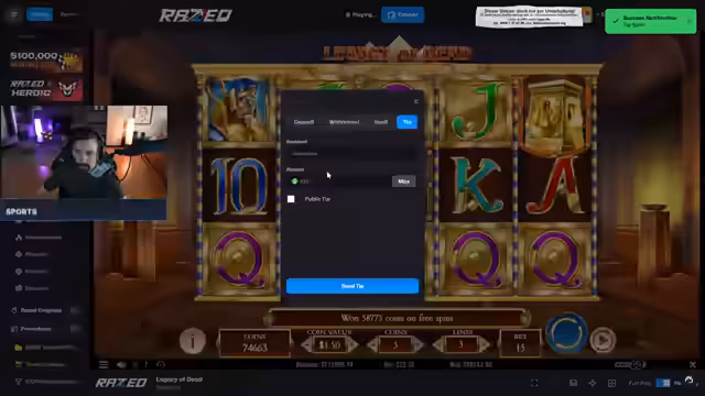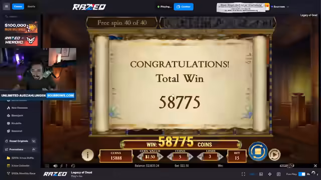 01:52:07Nach einem außergewöhnlichen Gewinn von 90.000 Dollar im Slot 'Legacy of Dead' wird dieser Erfolg mehrfach hervorgehoben. Der Streamer bedankt sich bei Cody für den Host und kehrt mit erneutem Einsatz zum Blackjack-Tisch zurück. Die Gewinne aus dem Slot werden im virtuellen Tresor verwaltet, während die Blackjack-Sessions mit veränderter Taktik und hohen Einsätzen fortgesetzt werden.