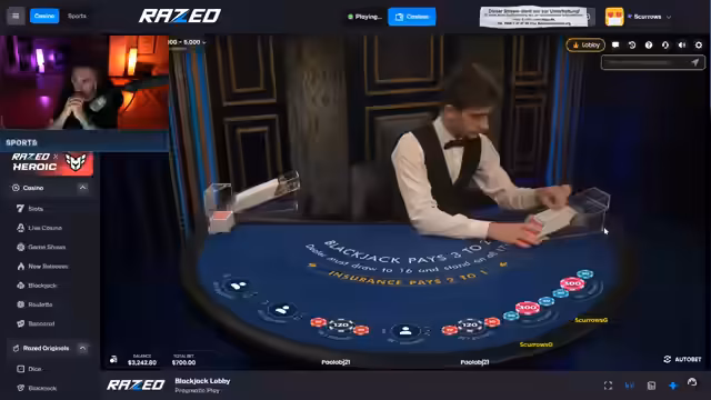 01:23:47Die Spielsession ist weiterhin von Pech und Misserfolgen geprägt. Der Streamer berichtet, dass der Dealer wiederholt 21 Punkte erreicht, was zu erheblichen Verlusten führt. Trotz einiger Sidebets, die gelegentlich Gewinne einbringen, summiert sich das Minus schnell auf Tausende von Dollar. Die Spieler am Tisch, darunter Batzi und Cody, diskutieren Strategien wie das Doppeln und Splitten von Karten, wobei der Streamer oft das Gefühl hat, die falschen Karten zu erhalten. Es kommt zu emotionalen Ausbrüchen, da die Verluste immer höher werden und das Spiel als unfair empfunden wird. Die Frustration erreicht ihren Höhepunkt, als der Streamer feststellt, dass er bereits 10.000 Dollar im Minus ist und das Gefühl hat, gegen ein manipuliertes System zu spielen.