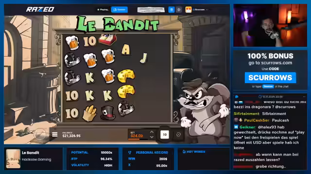 03:33:47Bei den Freispielen von 'Le Bandit' entsteht eine lebhafte Debatte im Chat, ob die rechte oder linke Seite der Freispiele profitabler ist. Der Streamer argumentiert, dass die rechte Seite grundsätzlich besser sei, hat aber selbst Pech, während jemand, der links gewählt hat, gewinnt. Dies führt zu einem humorvollen Streit mit einem Chat-User namens Diesel. Trotzdem bleibt er bei seiner Strategie, das Risiko einzugehen, und demonstriert so seine Spielphilosophie, bei der man Geduld und Risikobereitschaft benötigt.