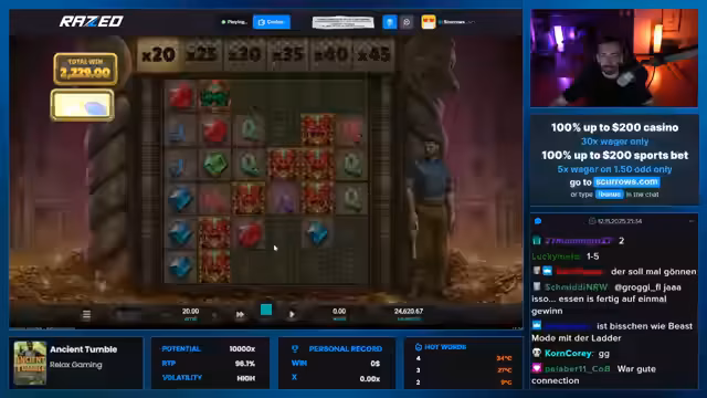04:11:07Der Streamer rät den Zuschauern, nur so viel zu verspielen, wie sie verkraften können. Es wird eine Diskussion mit einem neuen User im Chat geführt, der sich über die Regeln des Chats hinwegsetzt und mit DDoS-Angriffen droht, was der Streamer entschieden ablehnt. Die Suche nach Freispielen in verschiedenen Slots geht weiter, und der Streamer ist frustriert über fehlende Hits und Standbilder in den Spielen. Es werden verschiedene Spiele wie 'Hand of Anubis' und 'Ancient Tumble' auf Wunsch der Zuschauer gespielt. Der Streamer beklagt die fehlenden Chancen in einigen Spielen und die Notwendigkeit eines besseren Turbo-Modus. Er äußert seine Abneigung gegen 'Big Time Gaming'-Spiele, spielt sie aber auf Wunsch. Es wird ein 100x Gewinn in 'Fruit Party' erzielt, was die Stimmung wieder hebt. Die Diskussion über die verschiedenen Optionen in den Freispielen von 'Ancient Tumble' führt zu einer Abstimmung im Chat. Trotz einiger Deadspins wird ein guter Gewinn erzielt, was den Streamer zufriedenstellt.