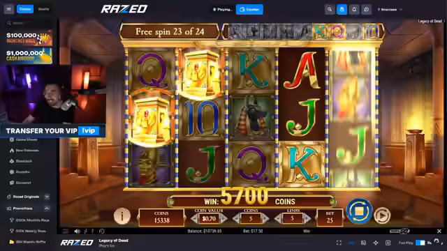 02:10:47Zu Beginn des Abschnitts wird ein Basketball-Sieg mit 73 zu 86,5 erwähnt, der jedoch keinen Gewinn einbringt. Der Streamer verliert im Anschluss 7000 Dollar durch ein anhaltendes Spiel an einem Slot, bei dem er trotz eines Ehrgeizes keine Freispiele erhält. Die Frustration steigt, als er die Slot-Maschine als Betrug und bodenlos bezeichnet und den Spielverlauf als krank und dreist empfindet. Die Chat-User werden für den Verlust verantwortlich gemacht, da sie das Spiel nachgefragt hätten.