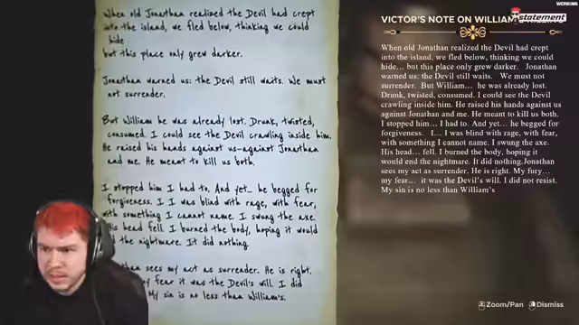 01:22:30Durch weitere Notizen und Erzählungen der drei Wärter Jonathan, William und Victor wird die tragische Vorgeschichte enthüllt. William wurde von einer übernatürlichen Macht korrumpiert und versuchte seine Kollegen umzubringen. Jonathan tötete ihn in Notwehr, doch die Gewalt blieb nicht folgenlos. In der finalen Konfrontation stellt sich heraus, dass der Streamer die Rolle von Jonathan einnimmt, der mit der Sünde seines Mordes zu kämpfen hat. Die Erkenntnis, dass er einen Kriegsbrief mit falschen Koordinaten anfeuerte und so Zivilisten in den Tod trieb, steigert den psychologischen Horror.