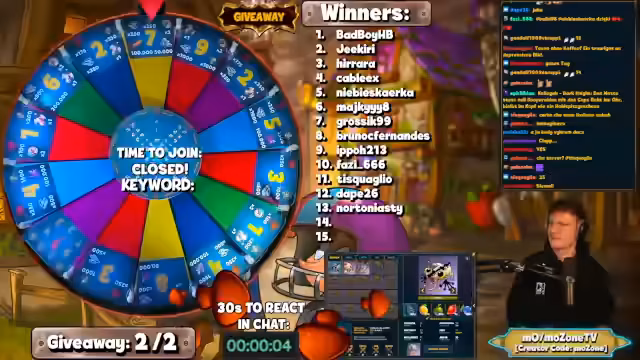 01:41:46Nach der Diskussion über die Spielentwicklung startet der Streamer mit dem Giveaway. Der Gewinner wird über eine Lotterie im Chat ermittelt, bei der bestimmte Keywords eingegeben werden müssen. Die Gewinner, darunter "Bad Boy", "Jakiri" und andere, werden bekannt gegeben. Der Stream endet kurz darauf und der Streamer kündigt an, nun zu einem zweiten, parallel laufenden Mobile Dungeon Stream zu wechseln. Dies markiert den Übergang zu einem neuen Event innerhalb des Live-Formats.