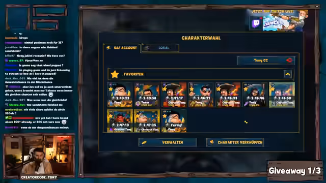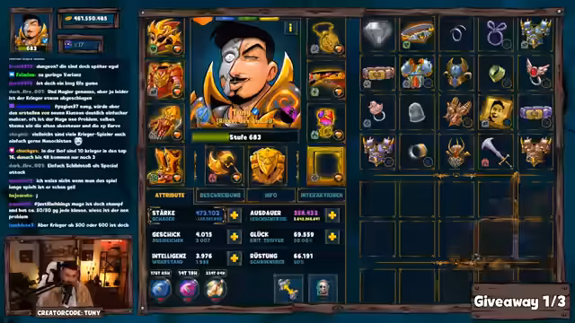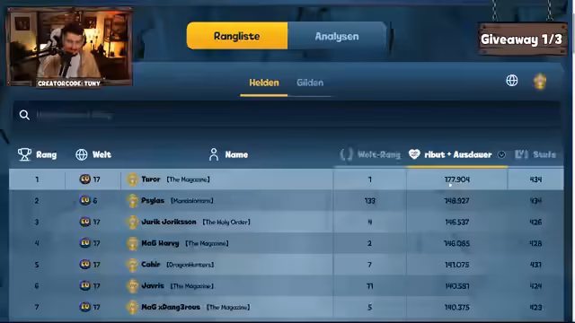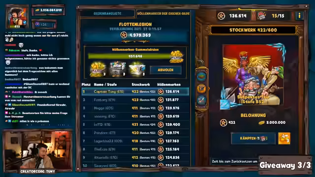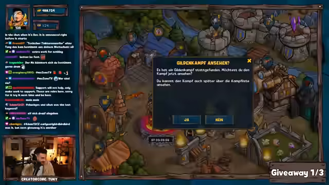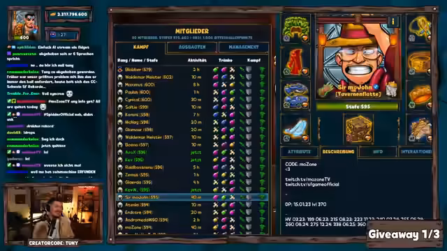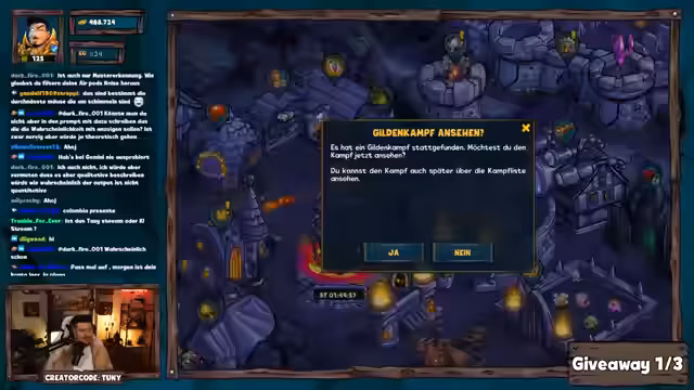02:42:37Es werden zwei Giveaways hintereinander veranstaltet, bei denen insgesamt zehn Gewinner gezogen werden. Das Keyword für die Teilnahme lautet 'Wann Krieger Glanz?'. Nach den Giveaways folgt eine Dungeon Challenge, bei der 1500 Pilze im Pot sind. Der Gewinner, Erdnussbiest, muss vorhersagen, ob die hinterlistige Hexe mit einer 3,42% Chance in über oder unter 15 Kämpfen besiegt wird. Bei einer korrekten Vorhersage gibt es 1500 Pilze, bei einer falschen 100 Pilze und bei einem Fehlschlag einen Trostpreis von 25 Pilzen. Trotz der geringen Chance und des Scheiterns in den letzten Versuchen, die Hexe zu besiegen, wird die Challenge mit Spannung verfolgt. Am Ende wird die Hexe nicht besiegt, was bedeutet, dass Erdnussbiest den Trostpreis von 25 Pilzen erhält und der Pot für das nächste Mal auf 1750 Pilze ansteigt.