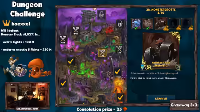 02:42:31Die Gewinner der Giveaways werden bekannt gegeben, darunter zweimal 'Undertaker' mit verschiedenen Paketen. Für die Dungeon-Challenge ist das Keyword 'Monster Truck'. Die Teilnehmer wetten, ob der Streamer den Monster Truck in über sechs Kämpfen besiegen kann. Der Streamer verliert die Wette, dennoch gibt es für Teilnehmer Trostpreise.