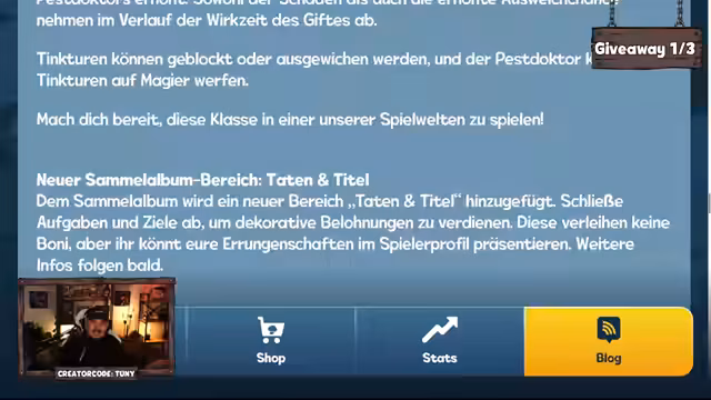 00:34:24Der Streamer präsentiert die Roadmap für das letzte Quartal des Jahres, wichtige Daten sind der Serverstart am 3. Oktober, der Glückstag am 17. Oktober sowie Halloween und die neue Pest-Doktor-Klasse, die Ende Oktober erscheinen soll. Besonders bei der Pest-Doktor-Klasse wird auf die Vorzüge und Schwächen eingegangen, wobei sie als starke Geschicksklasse mit hoher Ausweichchance dargestellt wird. Auch die Möglichkeit, Halloween-Items auf neuen Servern zu sammeln, wird erwähnt.