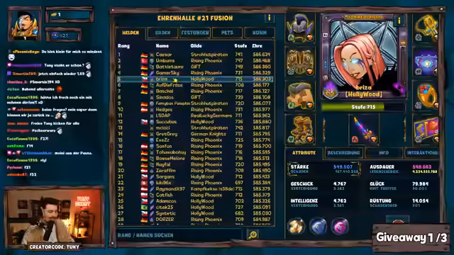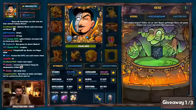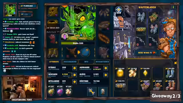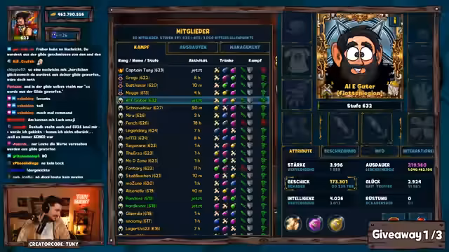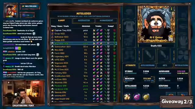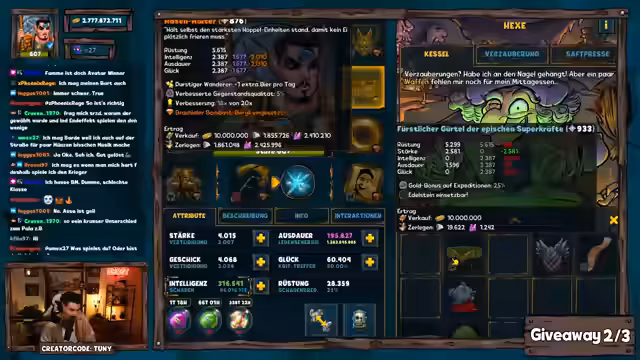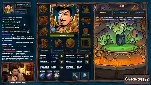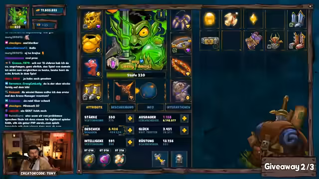02:47:03Der Stream wechselt zu einer interaktiven Dungeon Challenge, bei der der Streamer einen Igel besiegen muss. Die Zuschauer tippen darauf, ob es mehr als oder genau 80 Versuche dauern wird. Nachdem der Streamer nach 80 Kämpfen scheitert, wird der Gewinner Evil Wolf mit 25 Pilzen entschädigt. Darauf folgt ein großes Giveaway, bei dem mehrere Gewinner, darunter Lutzacek, Darth Snakeheart und Buffy, verschiedene Pakete gewinnen, die per Direktnachricht versendet werden.