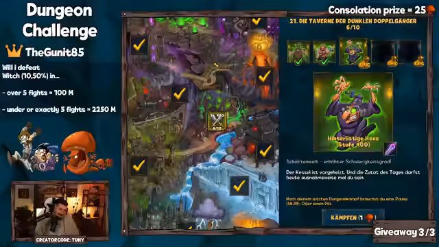 02:43:19Der Streamer startet die Dungeon-Challenge gegen den Witch-Boss. Nach mehreren Versuchen wird die Chance auf 10.5% für einen Sieg in unter fünf Kämpfen erhöht. Es wird eine Vorhersage (Prediction) für die Zuschauer gestartet, bei der sie wetten können, ob der Boss in unter oder genau fünf Kämpfen besiegt wird. Der Gewinner der Prediction erhält 2250 Pilze.