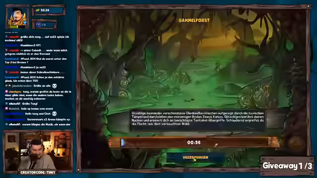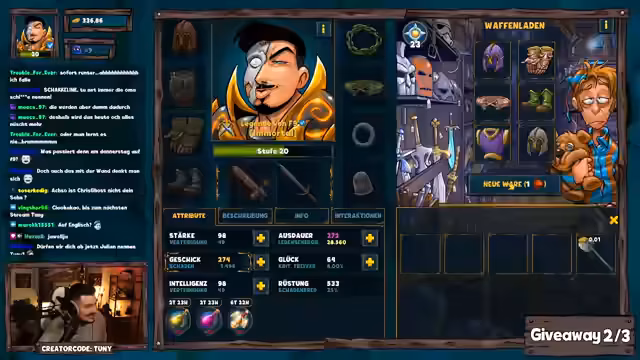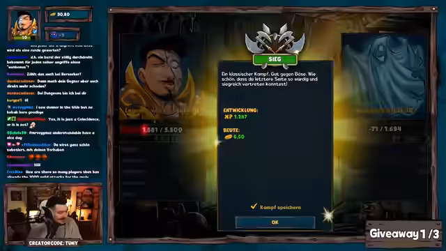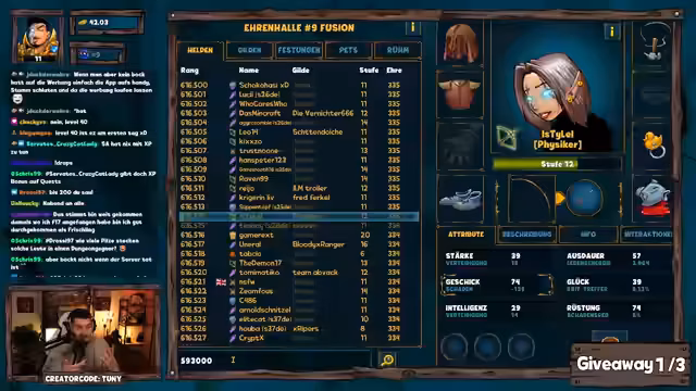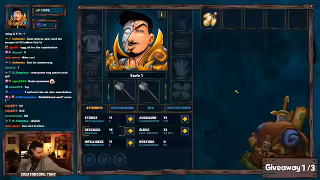 01:31:20Giveaways werden angekündigt, darunter eines mit dem Keyword 'Legende von F9'. Die Dungeon-Challenge mit 2250 Pilzen als Preis wird erwähnt, wobei die Erfolgschance bei 10,5% liegt. Gleichzeitig werden Probleme mit der Item-Verteilung nach einem Update diskutiert: Stats schwanken unerwartet, und signifikante Verbesserungen (Breakpoints) treten erst ab Level 12 auf. Während des Giveaways wird weiter gefarmt, um das Sammelalbum zu pushen.