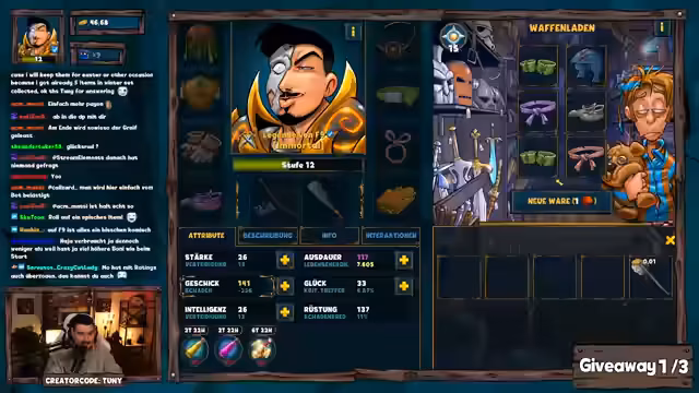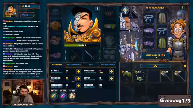 01:15:11Der Aufstieg von Level 7 auf 12 wird dokumentiert, begleitet von der Suche nach besserer Ausrüstung. massiver Goldmangel erschwert den Fortschritt, da ohne Gold keine Waffen verbessert oder Dungeons effizient gefarmt werden können. Der Streamer erklärt, dass bei einem regulären Serverstart Gold durch Events verfügbar wäre, hier jedoch fehlt. Stattdessen wird auf Quests und das Sammelalbum als Alternative gesetzt, um dennoch Level und Stats zu steigern.