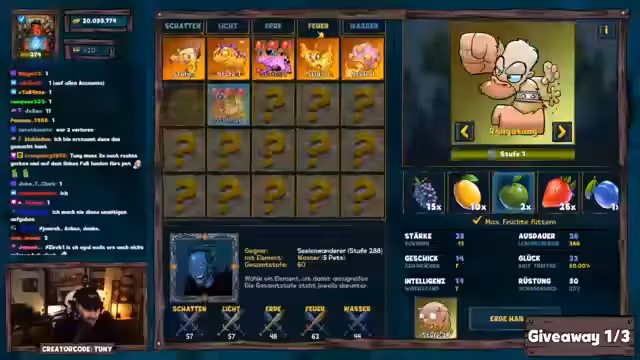 01:28:52Der Stream beginnt mit intensivem Gameplay in Shakes & Fidget. Es werden verschiedene Pakete fürViewer verlost, darunter Package 2 für Torsal, DJ Sb1, Akikath und Dante. Ein Giveaway läuft mit dem letzten Paket, das an Dante geht. Nebenbei werden Dungeon-ähnliche Aktionen durchgeführt und ein Ausdauertrank ist leer, was ein Nachjustieren erfordert. Die aktuelle Aktion zielt darauf ab, Seelen zu farmen und zu verteilen.