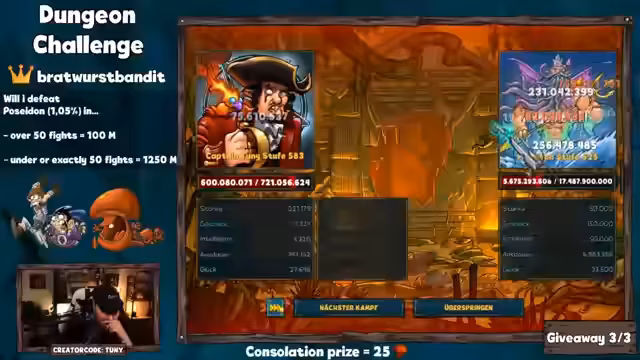 02:23:44Nach einer weiteren Dungeon-Challenge, die Bratwurstbandit leider verlor, wird ein weiterer Gewinner gezogen. Der Streamer startet einen neuen Giveaway mit dem Keyword „Poposeidon“. Es folgt die Verlosung von Paketen fürViewer wie Jaquito, Crazy Man und Epic Fall Zwerg. Der Stream endet mit dem Start eines Raids bei Beneko und persönlichen Verabschiedungswünschen an die Community.