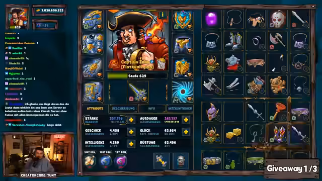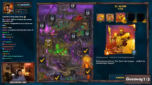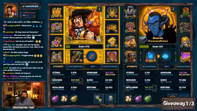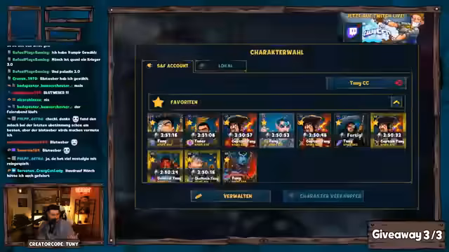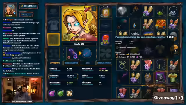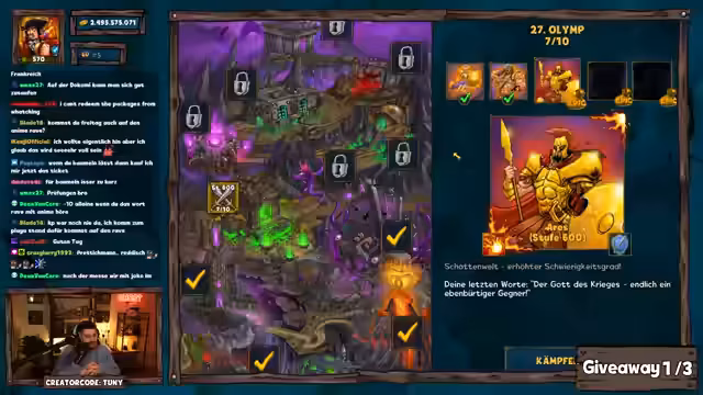 01:53:07Zur Unterhaltung der Zuschauer werden mehrere Giveaways durchgeführt. Dazu müssen Teilnehmer in einem vorgegebenen Zeitfenster ein Keyword im Chat eingeben. Nachdem mehrere Gewinner ermittelt und ihre Pakete verlost wurden, findet eine Dungeon-Challenge statt. Hier muss eine Entscheidung getroffen werden, ob ein Boss mit einer sehr geringen Gewinnwahrscheinlichkeit in über oder unter 30 Kämpfen besiegt wird. Der Streamer entscheidet sich für die riskante Variante und scheitert knapp, woraufhin eine Teilnehmerin eine kleinere Trostprämie erhält.