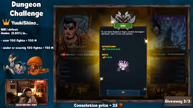 02:56:42Die Challenge gegen Hades beginnt mit dem ersten von 100 Versuchen. Streamer analysiert live die Kampfsituation und betont die entscheidende Rolle der Begleiter und deren Fähigkeit zum Ausweichen. Trotz vieler Anläufe und hoher Schadenswerte gelingt es nicht, Hades zu besiegen. Nach 130 Versuchen scheitert das Unternehmen knapp, was zum Trostpreis von 25 Pilzen für Yuki führt. Die hohe Anzahl der Versuche verdeutlicht die Schwierigkeit der Herausforderung.