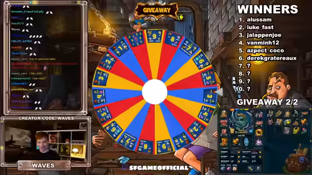 00:44:12Der Stream kündigt das erste von zwei Giveaways an. Die Teilnahme erfolgt durch das Einmalige Eingeben eines Keywords, hier des Ausrufezeichens, innerhalb einer Minute. Nach Abschluss des Timers werden fünf Gewinner gezogen. Ihnen werden einfache Fragen gestellt, wie Lieblingsfarbe oder höchster Charakter-Level. Anschließend erhalten die Gewinner durch einen Glücksrad-Spin ihre jeweiligen Pakete. Der Streamer erklärt, dass die Codes für die Gewinne manuell und frühestens am nächsten Werktag verschickt werden, und weist die Gewinner darauf hin, ihre Privatsphäre-Einstellungen so anzupassen, dass sie Nachrichten empfangen können.