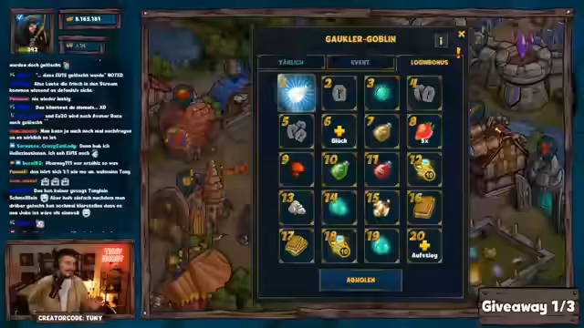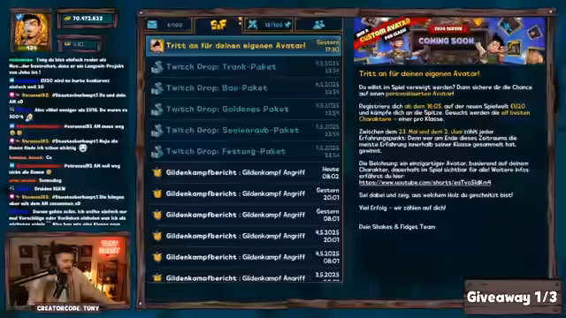 01:38:15Ein großes Giveaway wird im Stream durchgeführt. Der Streamer ruft die Zuschauer auf, an mehreren Giveaways teilzunehmen und kündigt ein drittes an. Er weist darauf hin, dass die Gewinner über einen Zeitraum von ein bis zwei Tagen eine Nachricht vom Kanal erhalten werden und Geduld walten lassen sollen. Mehrere Gewinner wie 'Windhund', 'BVB-Kalle', 'Lego', 'Iron Sky' und 'Kudowu' werden bekannt gegeben und ihre Gewinne werden ihnen zur Auswahl präsentiert.