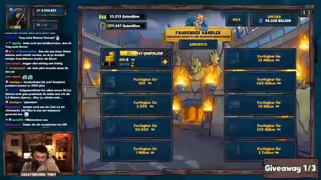 02:25:46Im Stream wird ein Gewinner für ein Giveaway bekanntgegeben. Es handelt sich um einen Spieler namens Badabuto, der in der Gilde des Streamers aktiv ist. Kurz darauf wird eine neue Challenge ins Leben gerufen, die sich gegen den Bossgegner Poseidon richtet. Die genauen Bedingungen der Wette werden erläutert, bei der es darum geht, ob es gelingt, Poseidon innerhalb von unter 150 Versuchen zu besiegen. Für den Fall eines Scheiterns winkt ein Trostpreis in Höhe von 25 Pilzen.