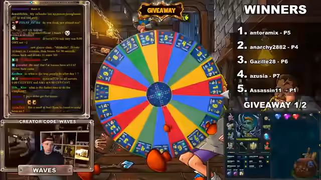 00:25:08Nach der Ziehung der Gewinner wird ein Glücksrad für die Preisverteilung gedreht. Antoramix erhält das Fan-Favorite Paket 5, Anarchy Paket 4, Ghazille Paket 6, Asu Paket 7 und Assassin11 Paket 1. Nachdem das Giveaway erfolgreich durchgeführt wurde, konzentriert sich der Stream wieder auf das Gameplay. Man stellt fest, dass der Streamer im Rang gefallen ist und nun schwächere Gegner in der Rangliste angreifen kann, um Gold zu farmen.